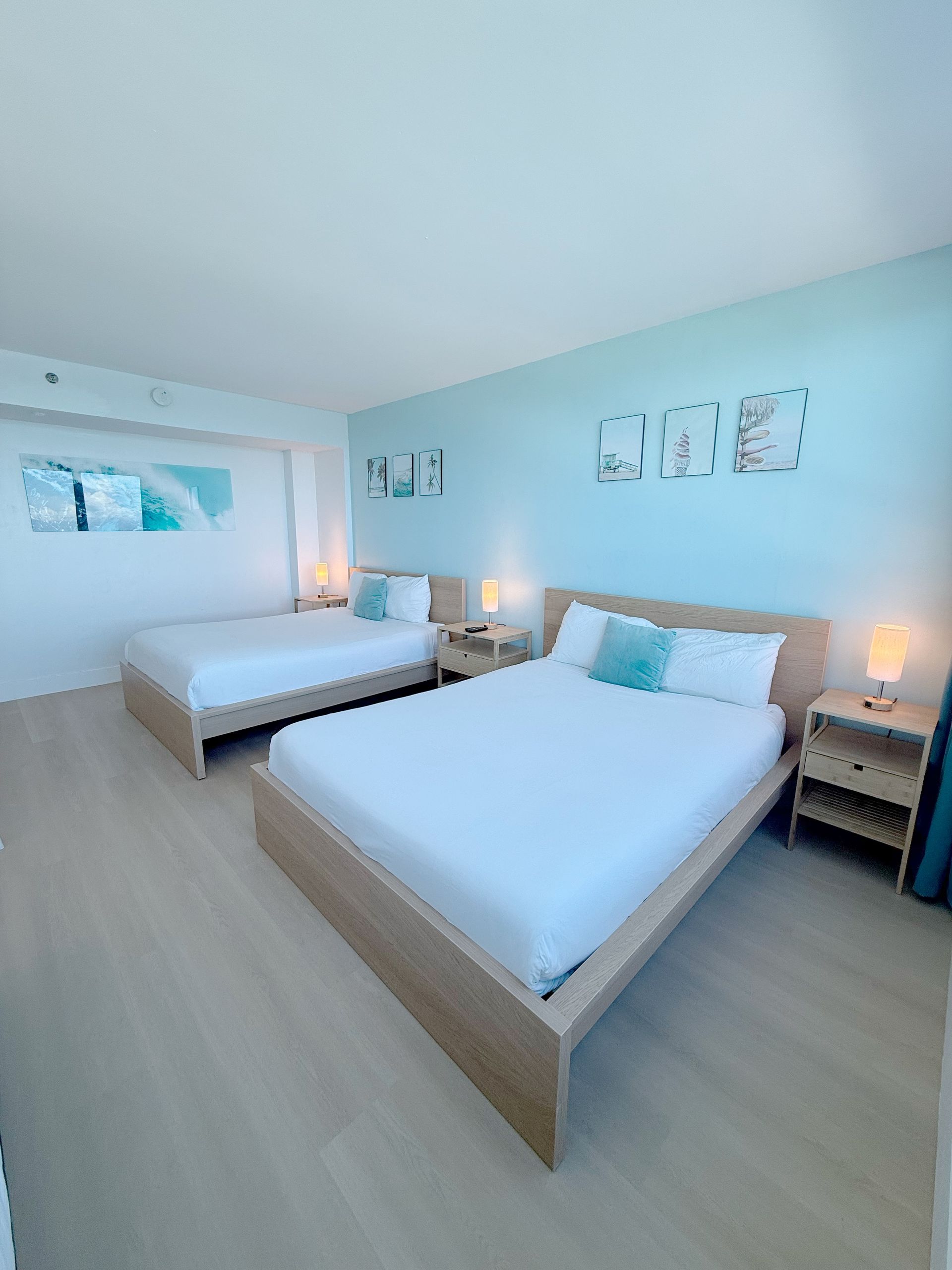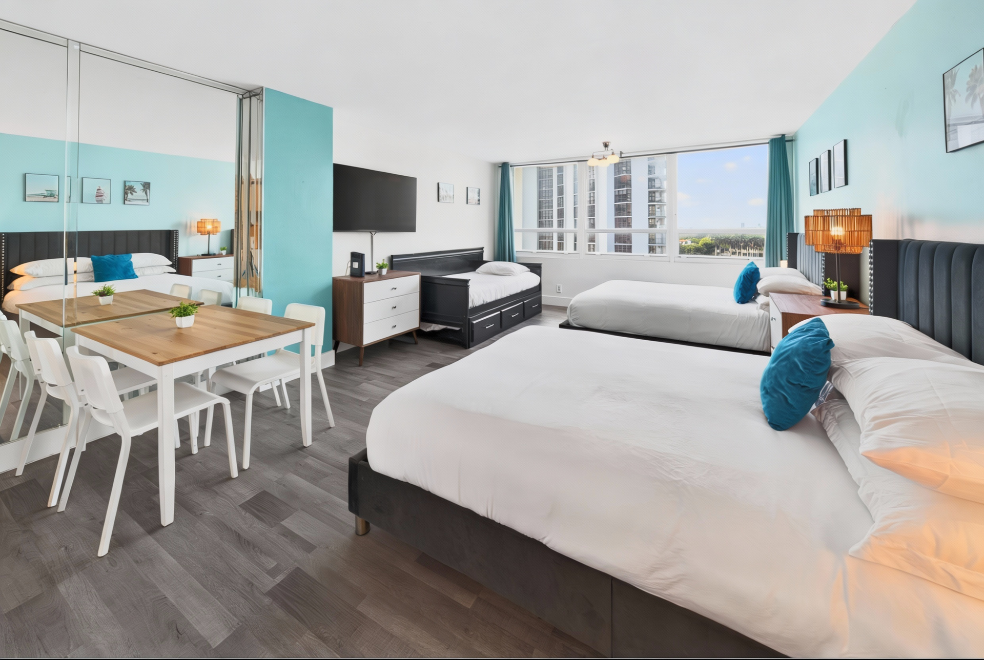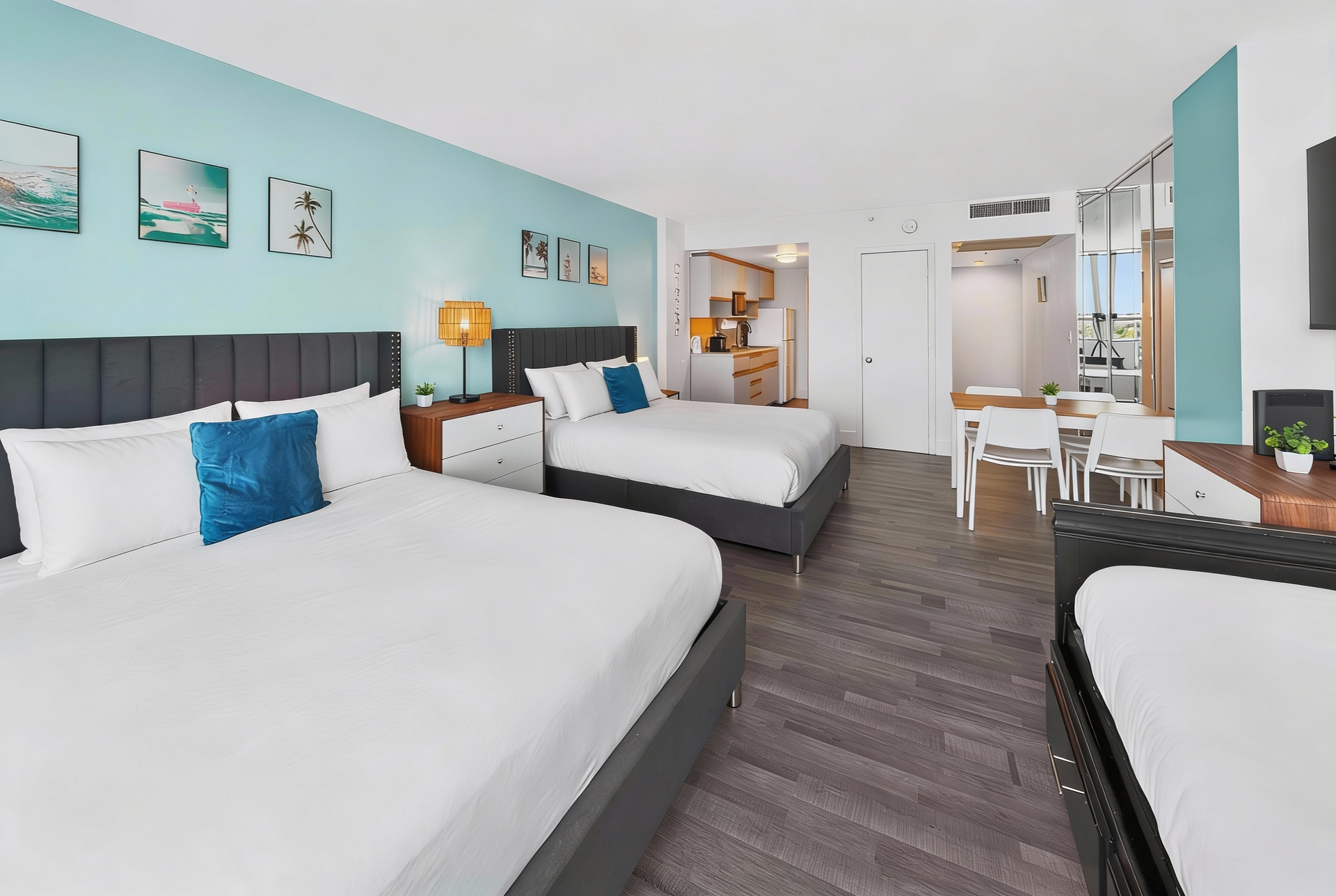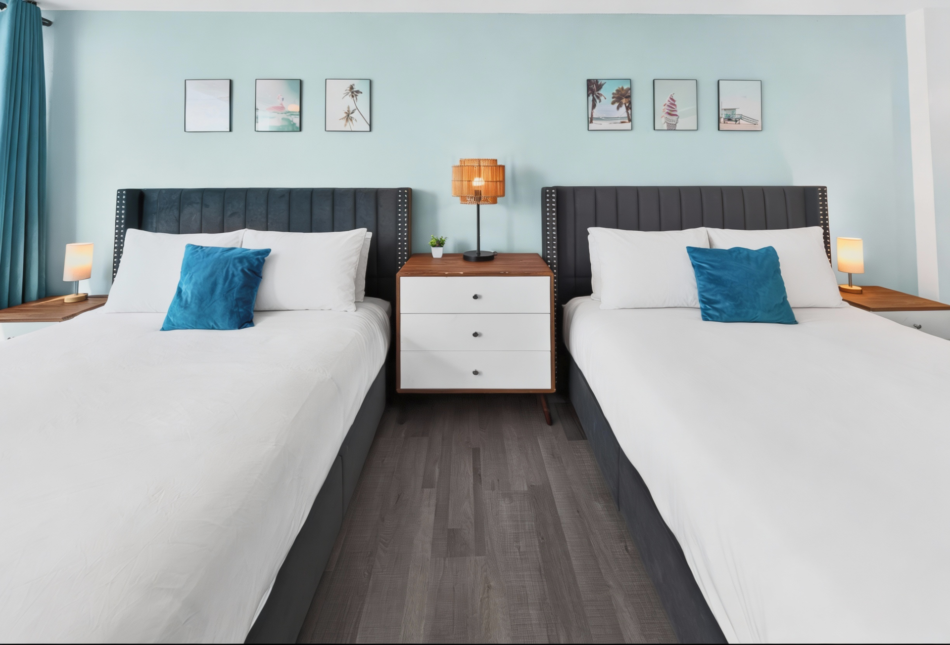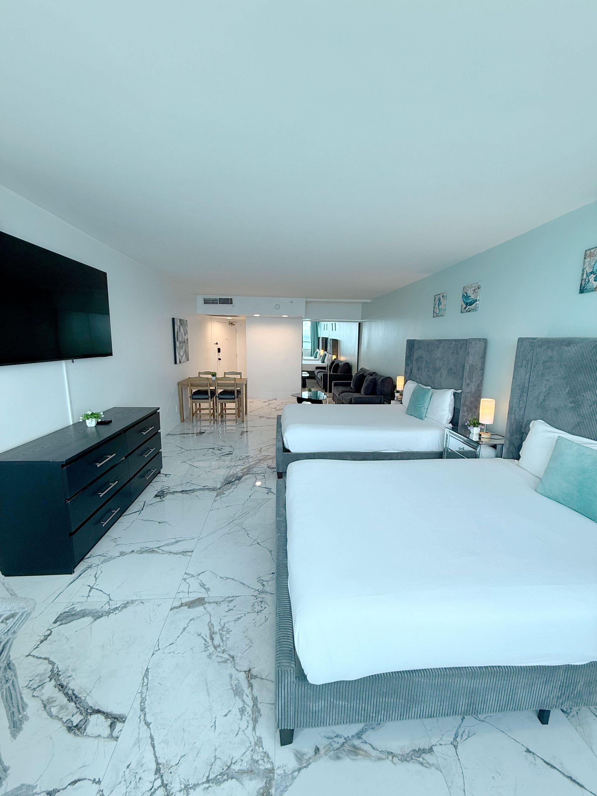 Beds: 1 King bed in the 1st bedroom, 2 Queen beds in the 2nd and Sofa bed in the living room