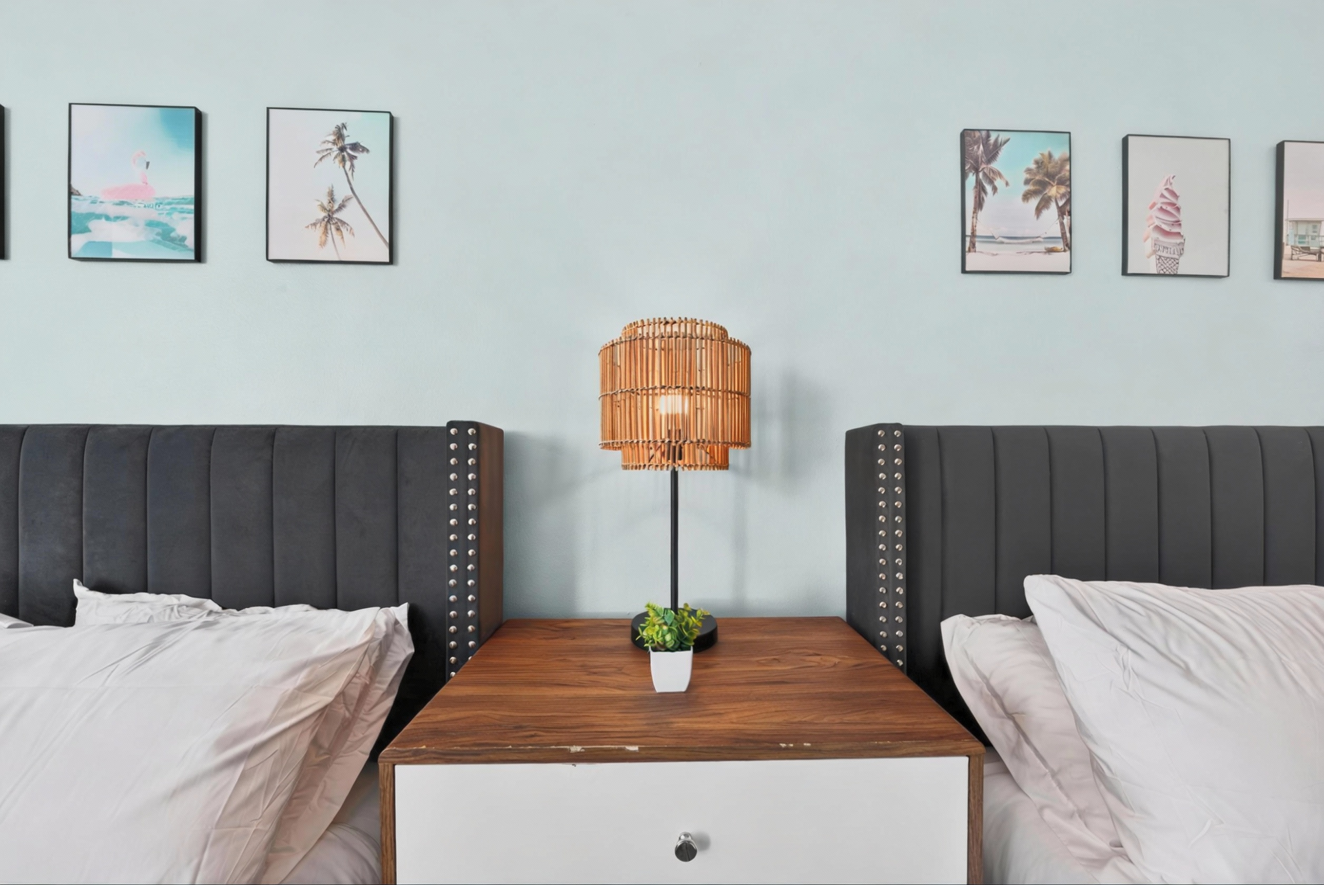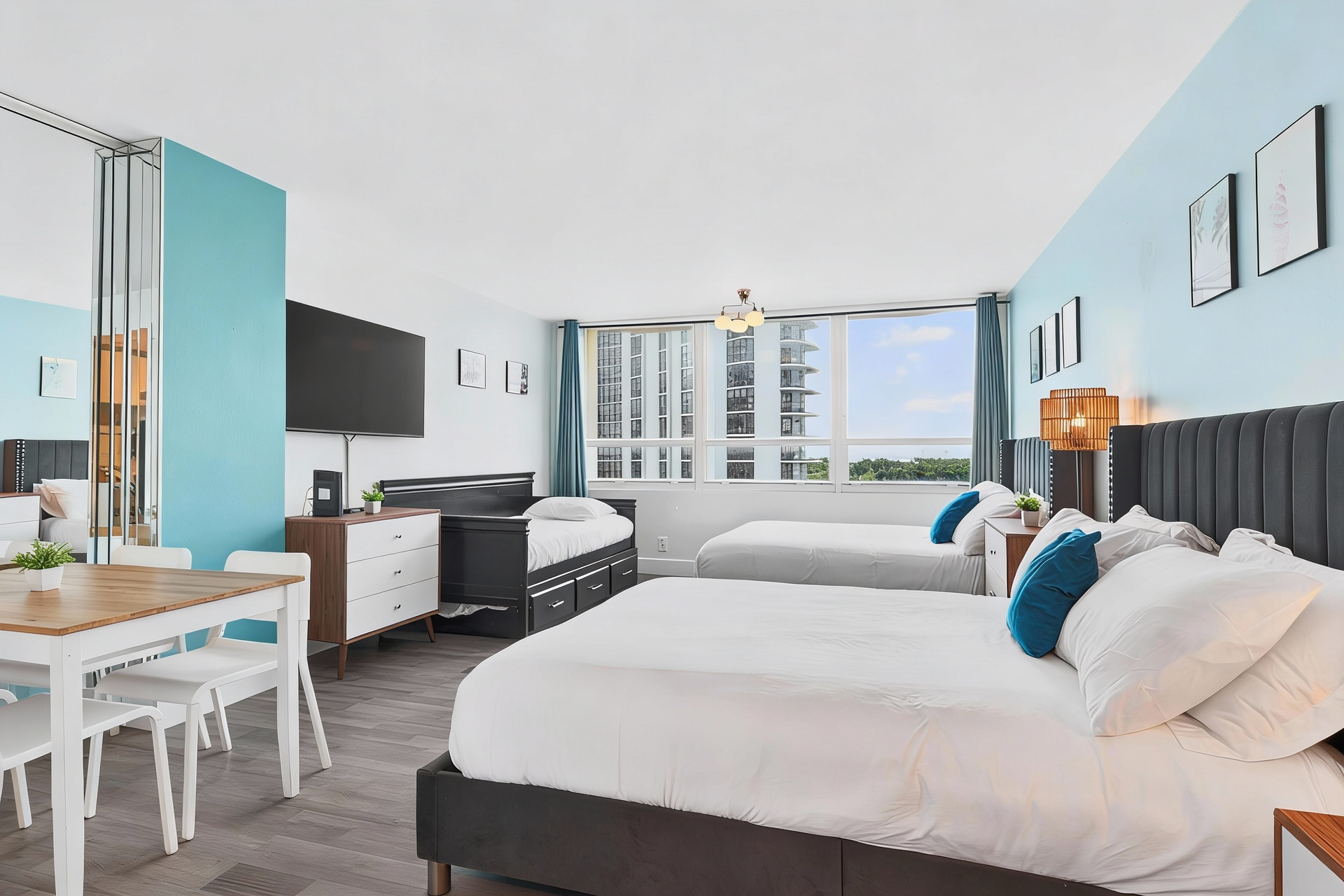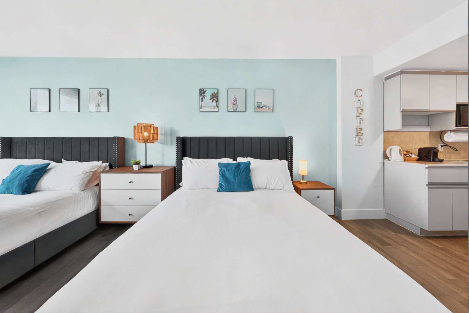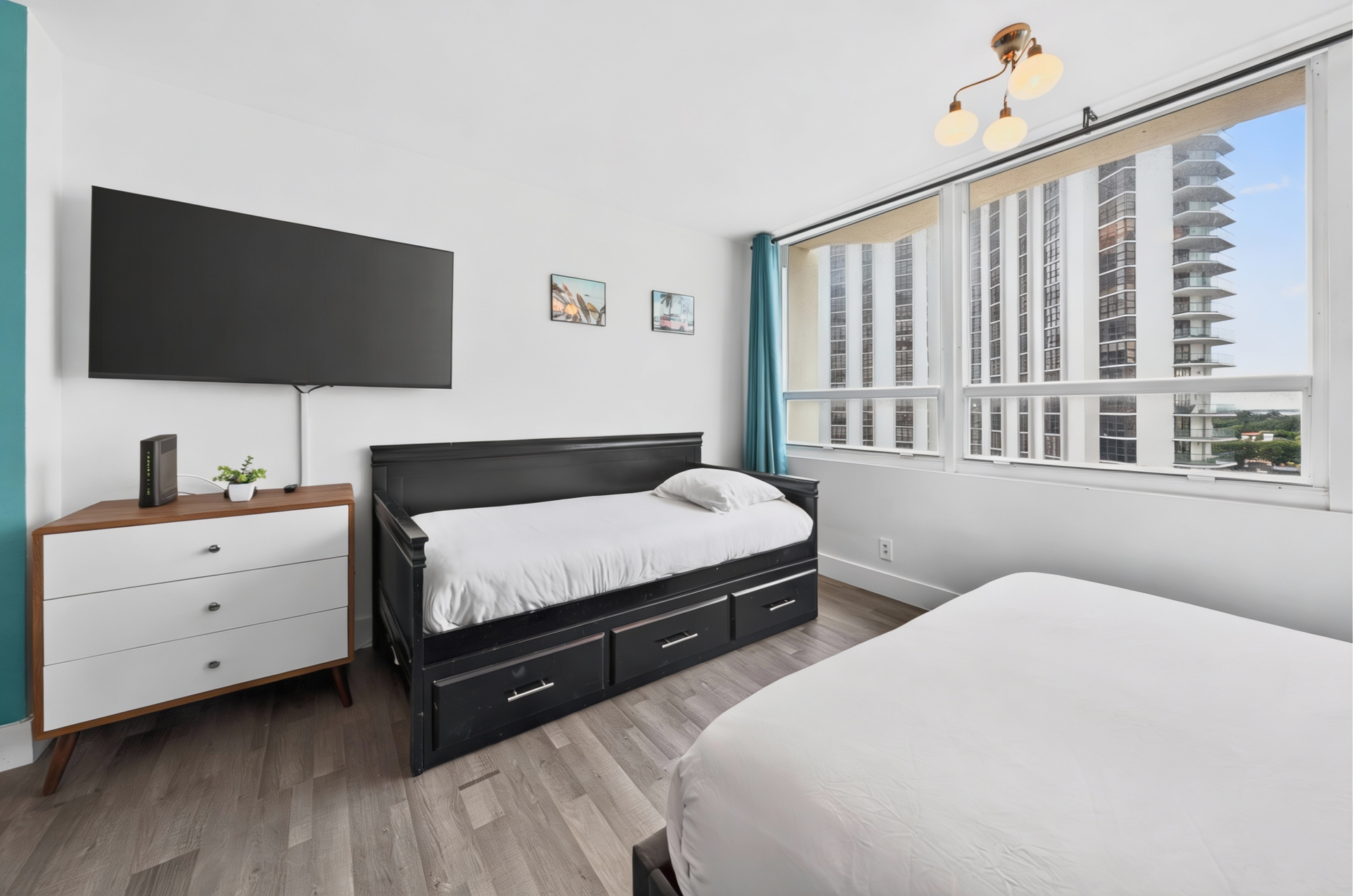 Beds: 1 King bed in the 1st bedroom, 2 Queen beds in the 2nd and Sofa bed in the living room