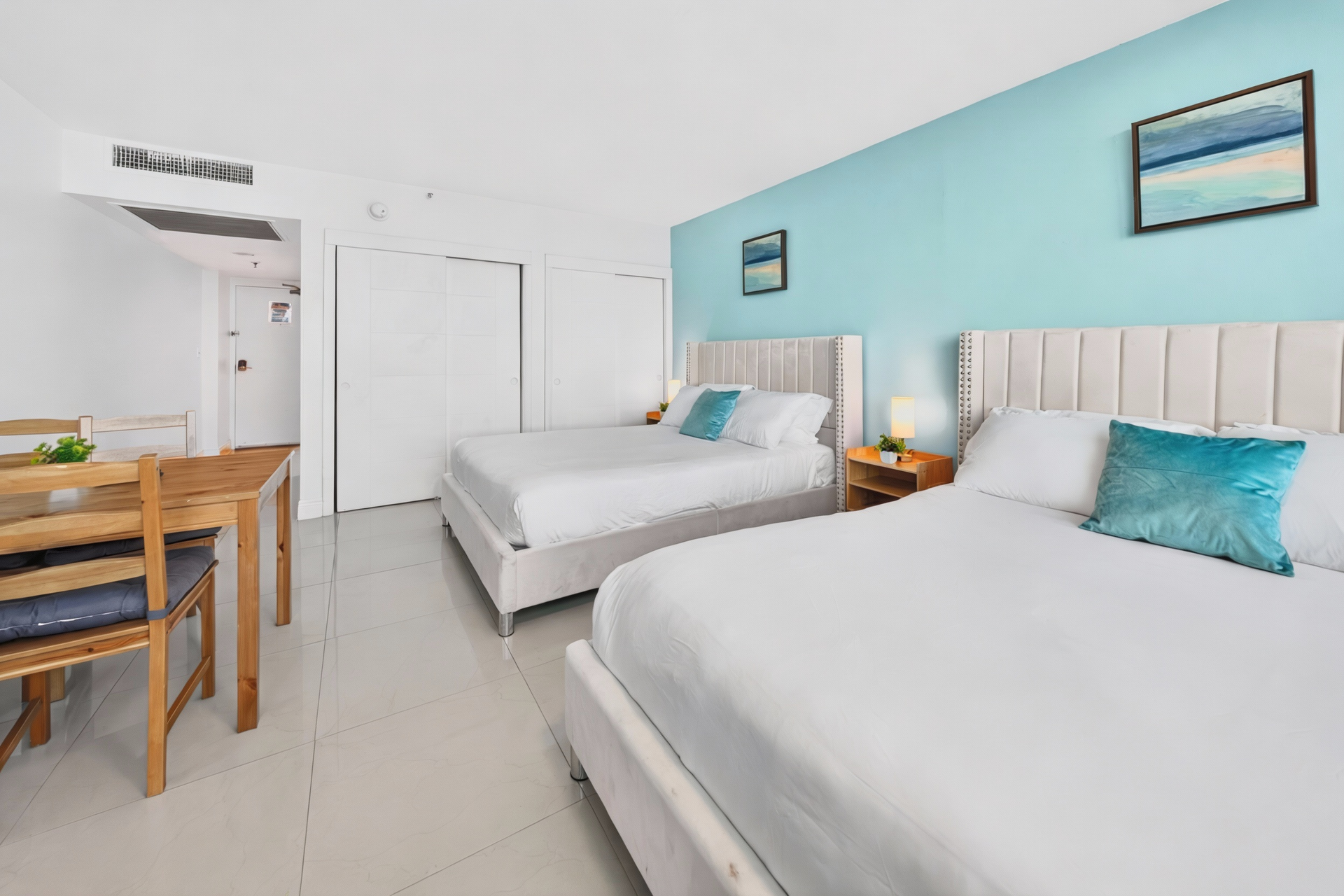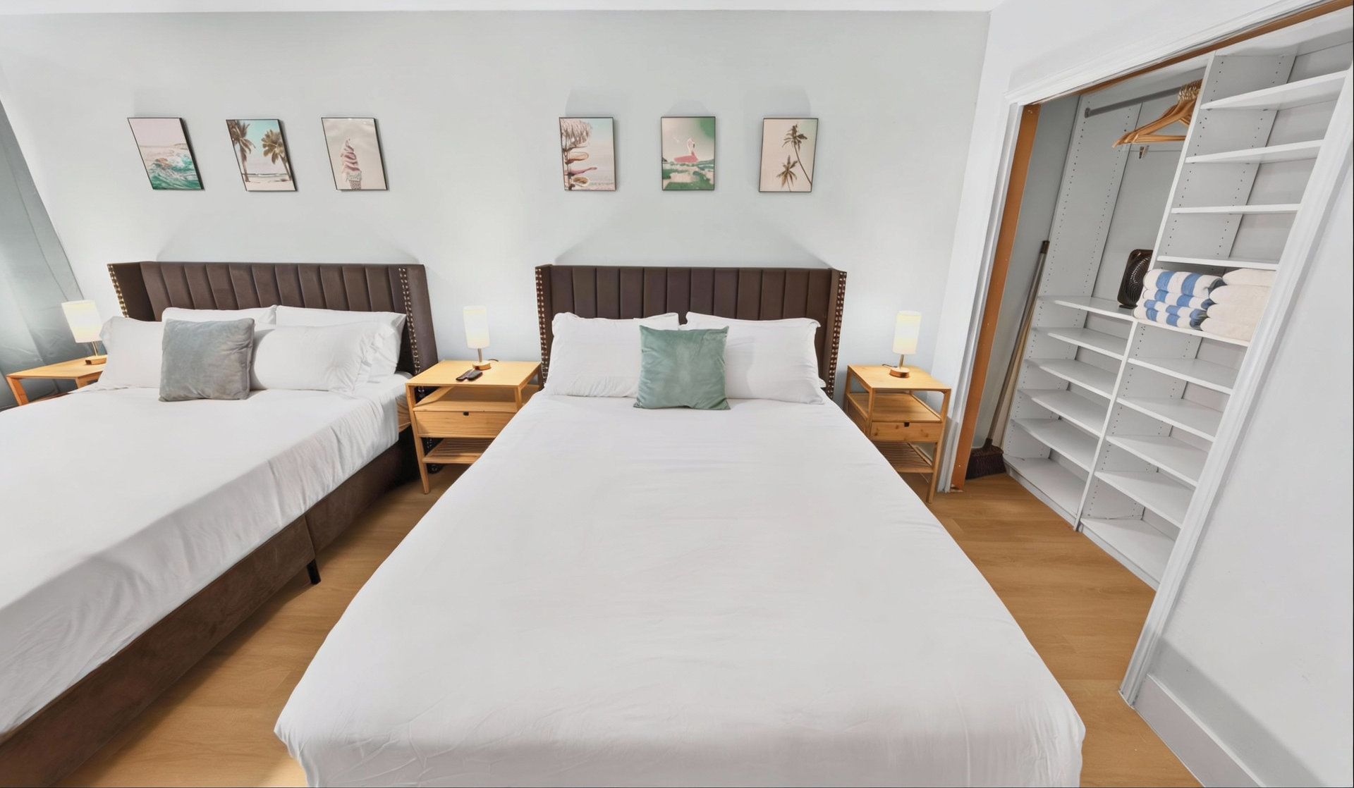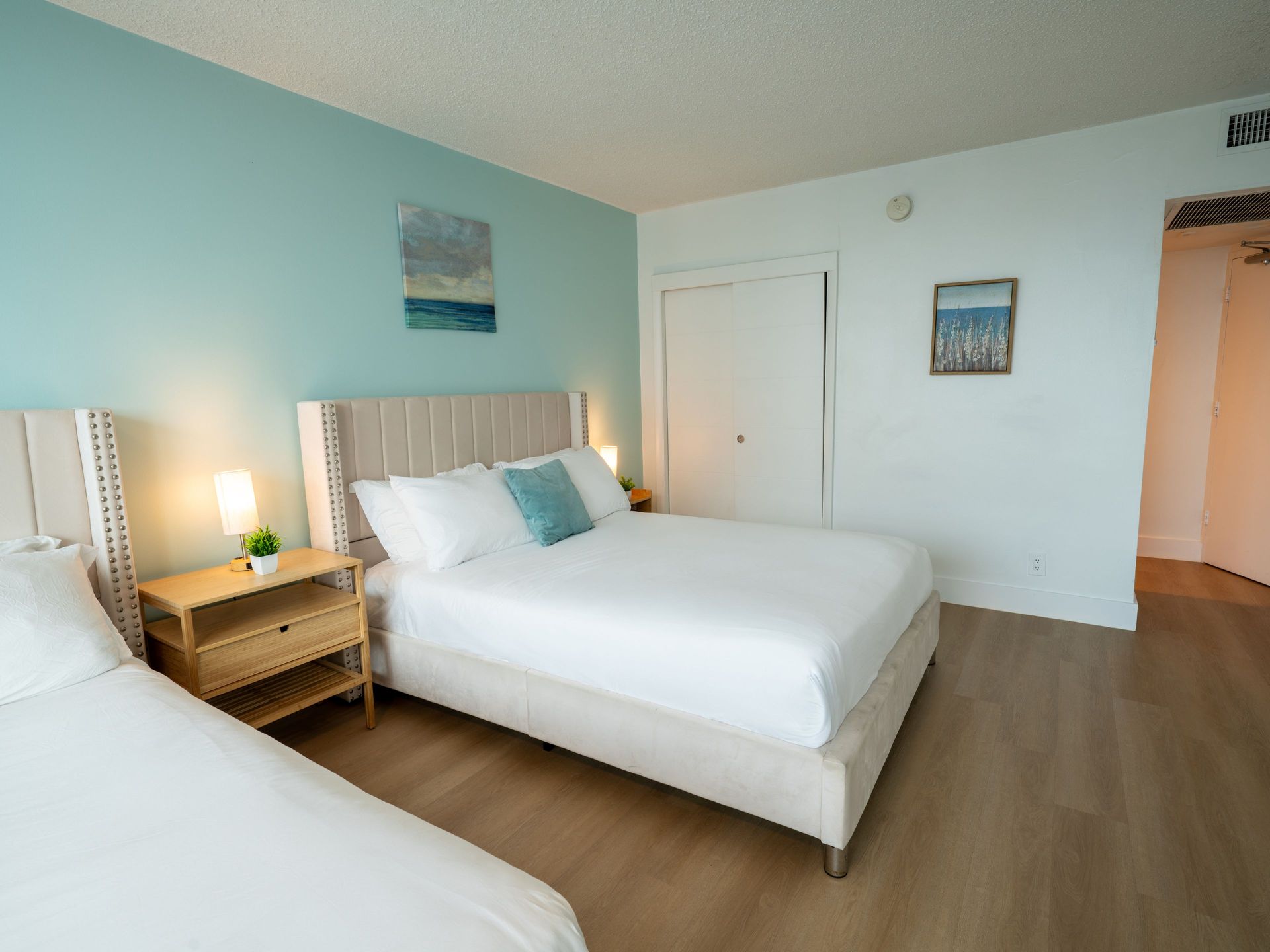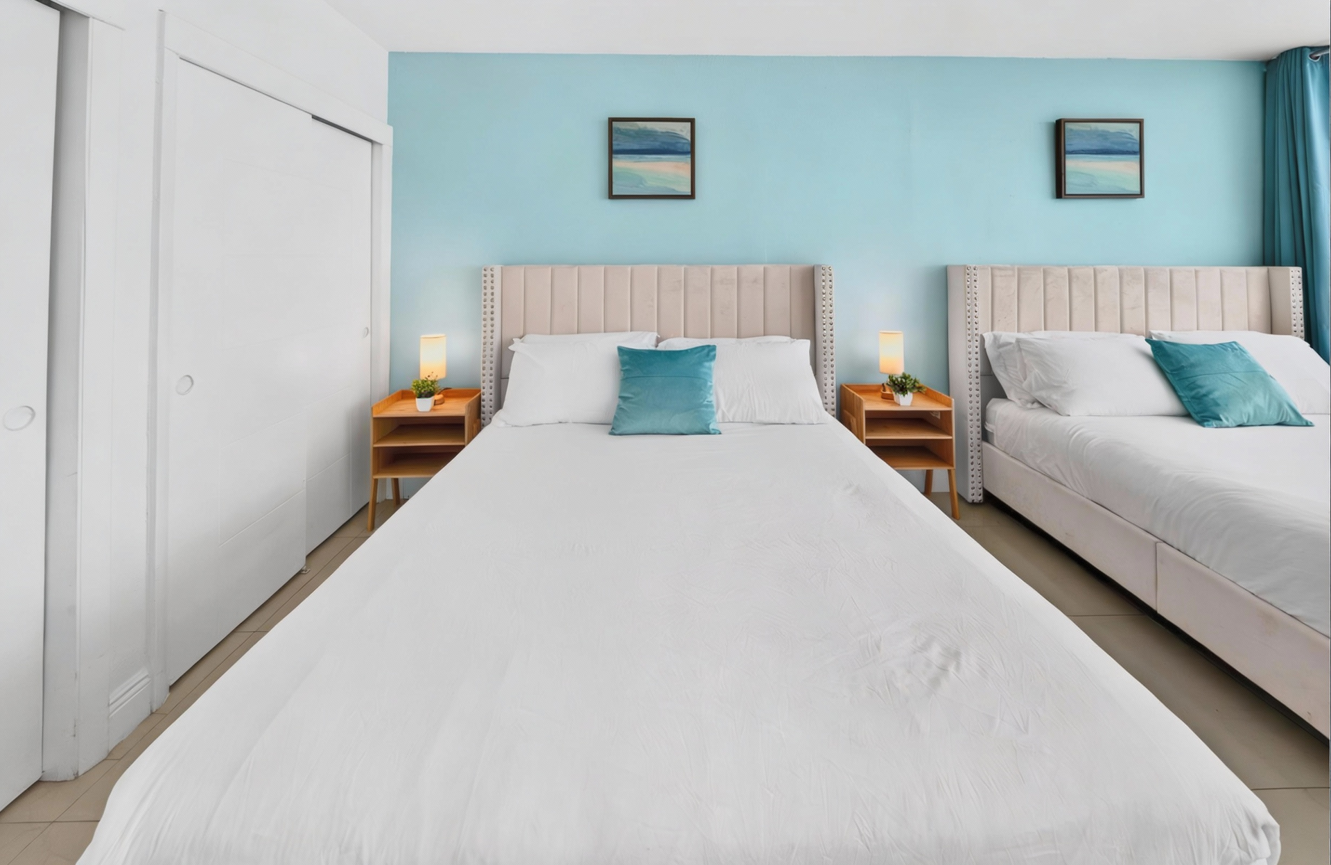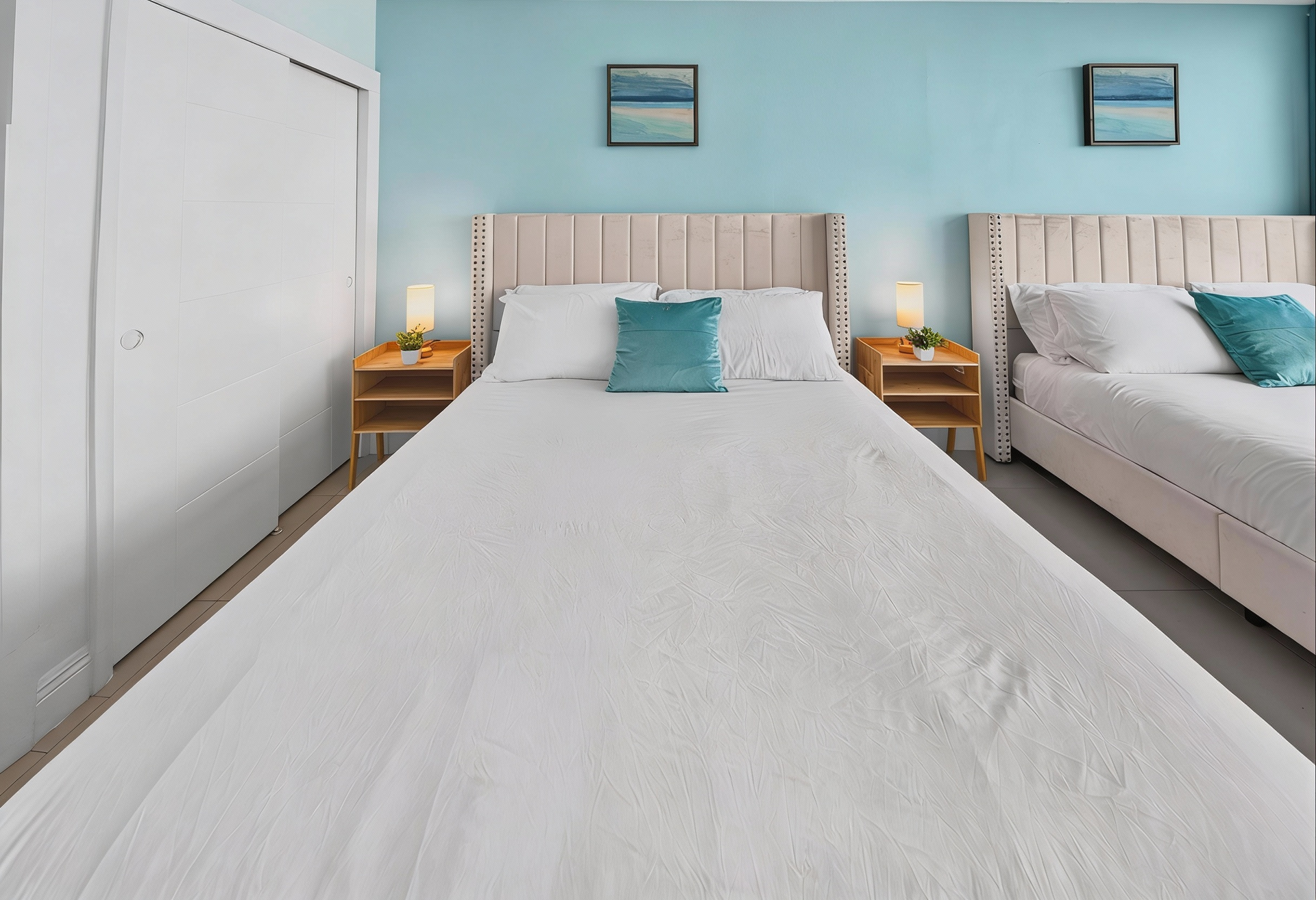 Beds: 1 King bed in the 1st bedroom, 2 Queen beds in the 2nd and Sofa bed in the living room