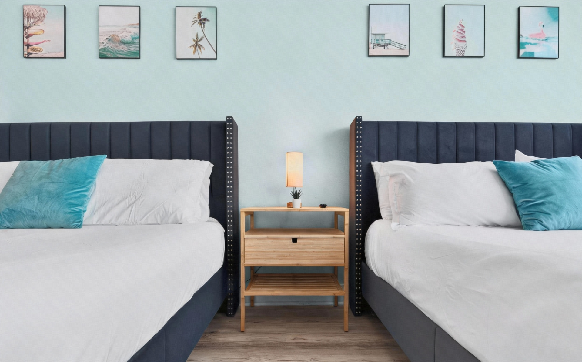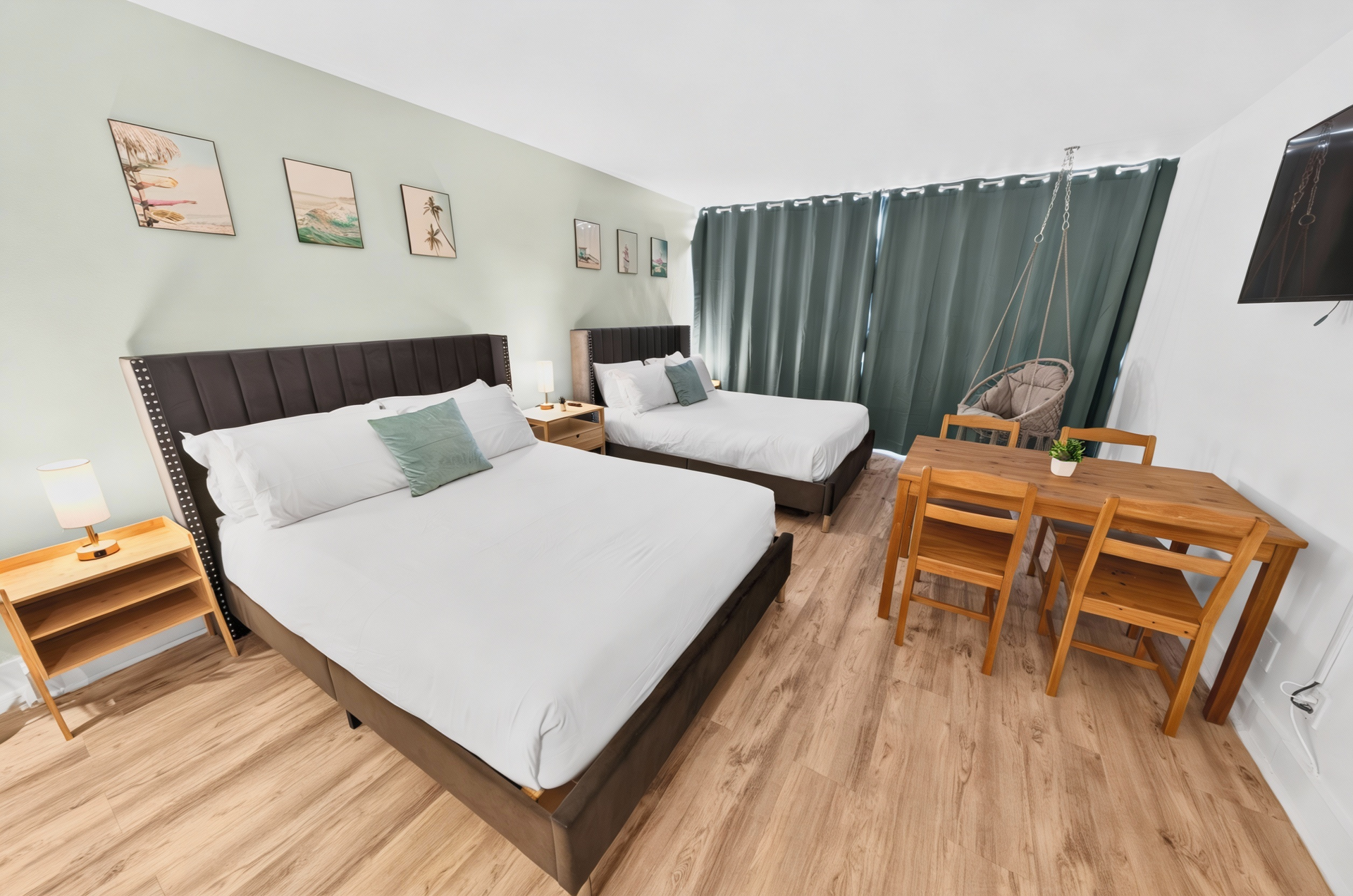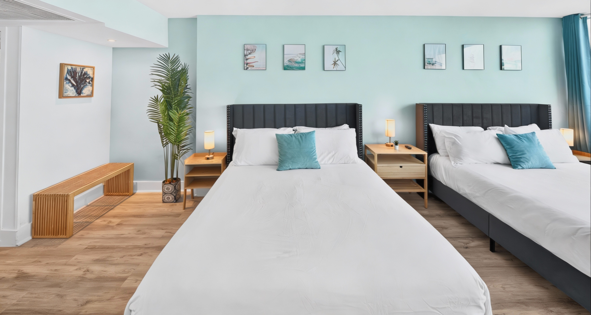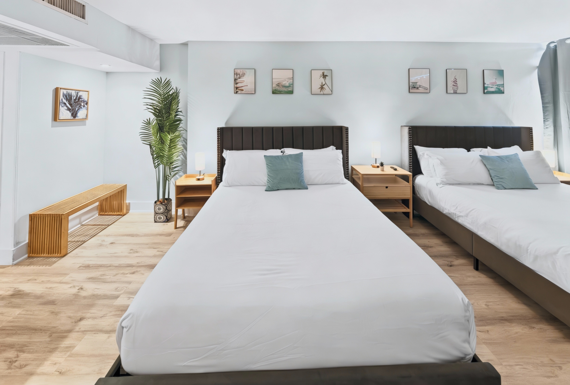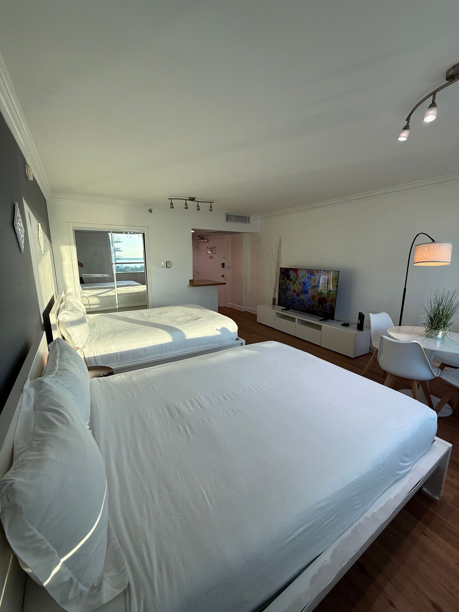Beds: 1 King bed in the 1st bedroom, 2 Queen beds in the 2nd and Sofa bed in the living room