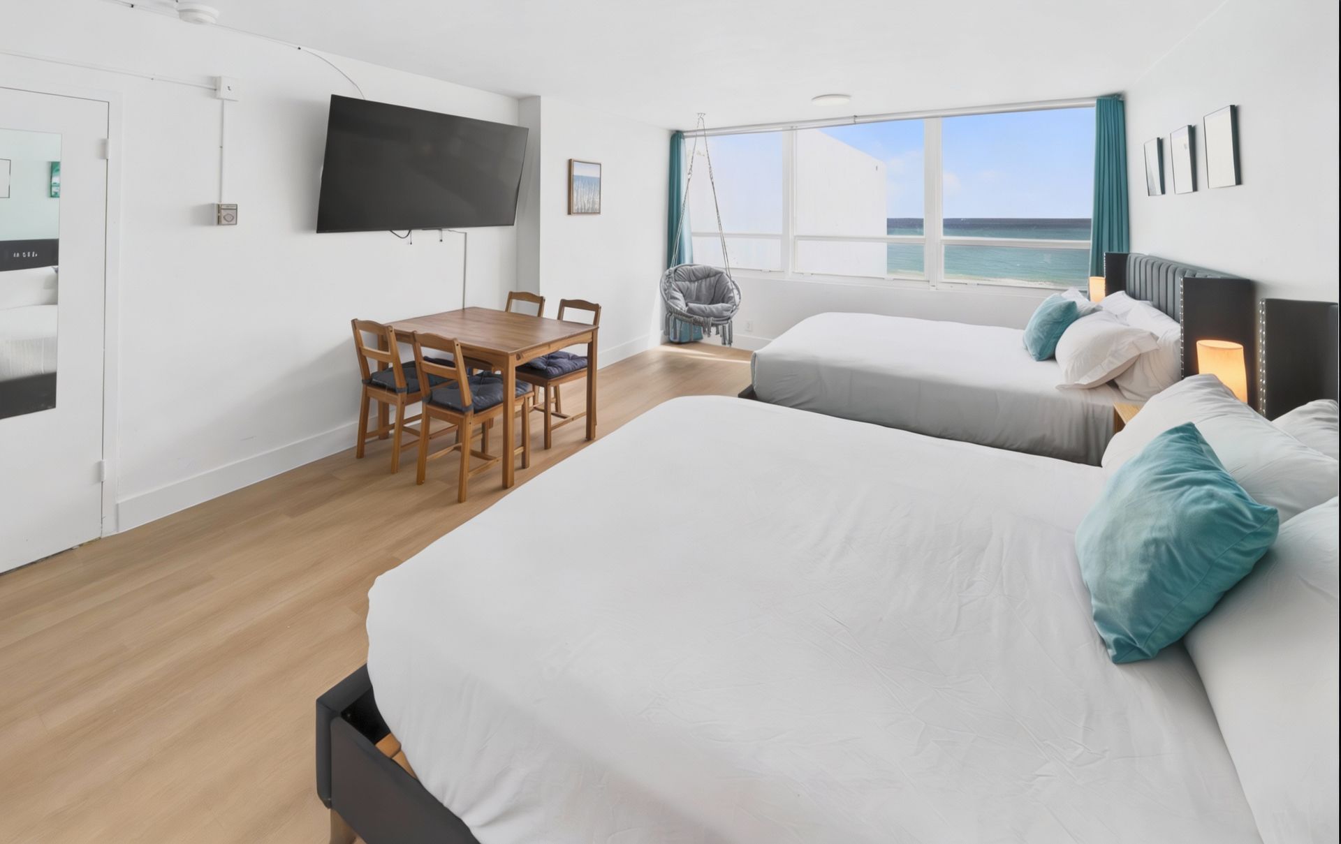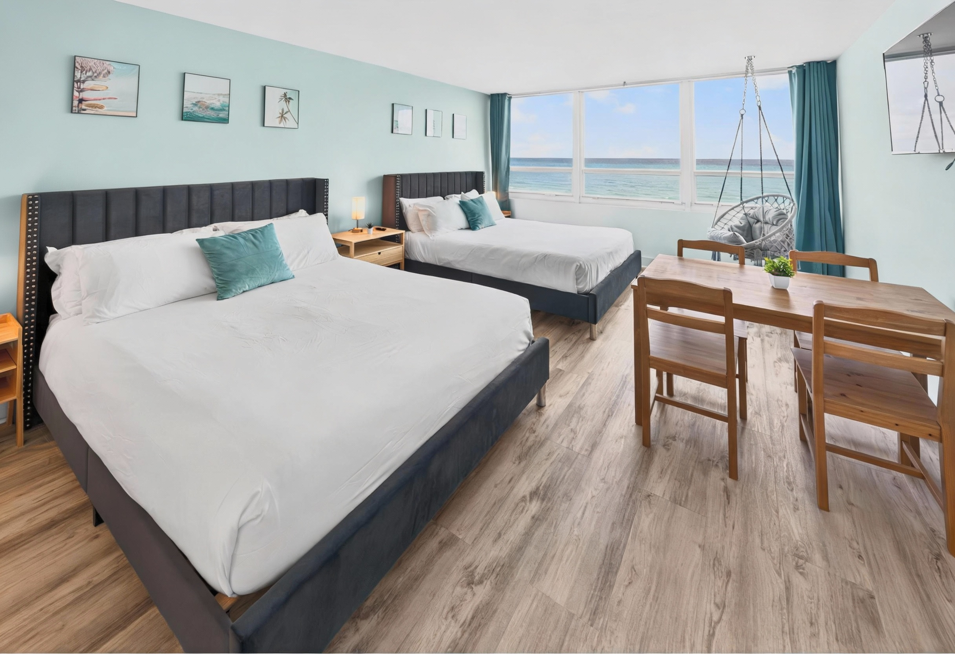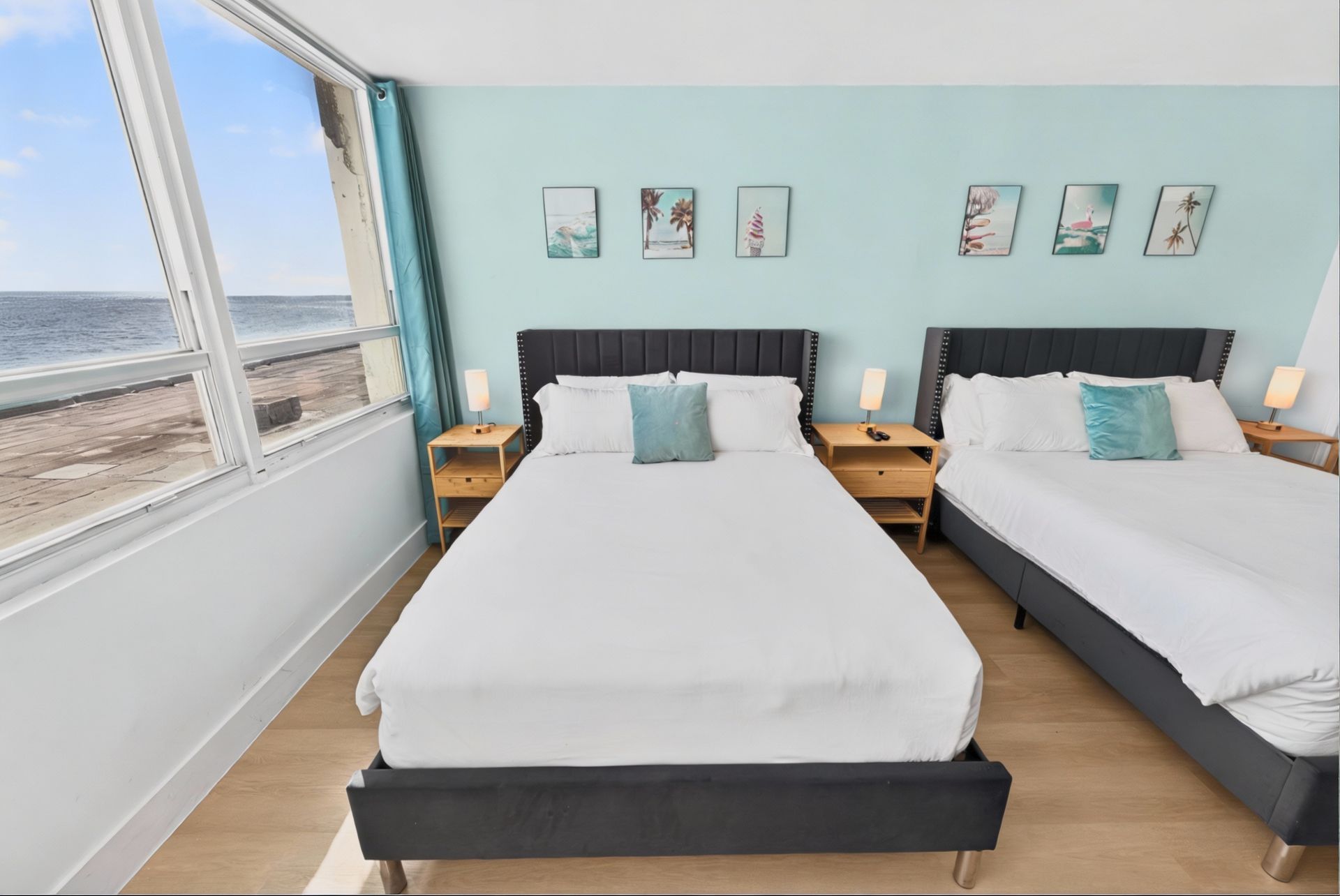 Beds: 1 king in the first bedroom, 2 full beds in the loft area and 2 full beds in the bedroom downstairs , and balcony to the beach